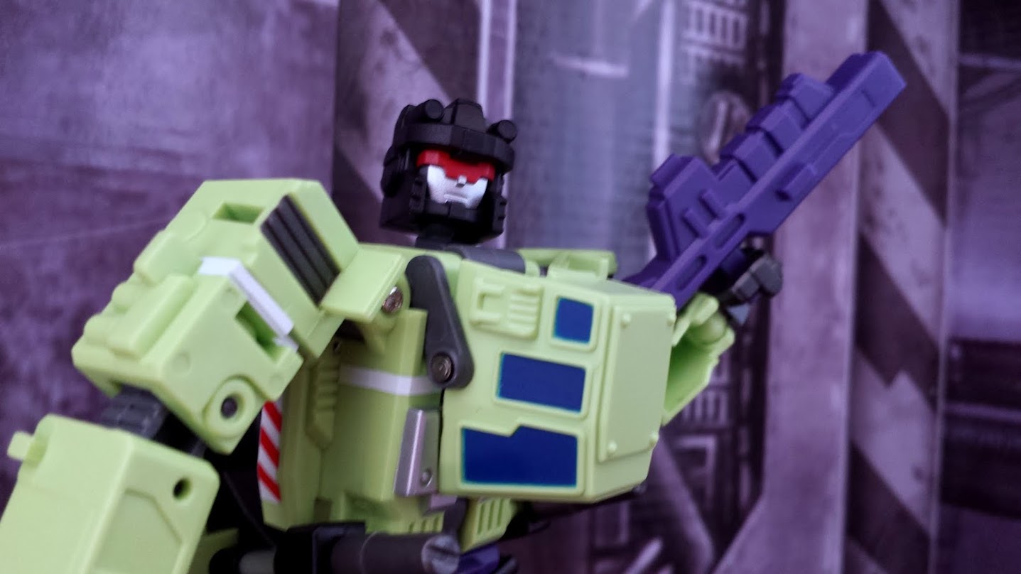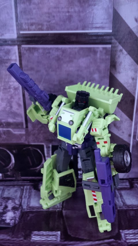 When I finally got to Giant mode, it was downhill from there. Was a fairly easy set up and you could pull more gimmicks with his crane and guns to form one cool looking assault weapon. Not that I condone violence. Because of Generation 1' s inconsistency of how Giant (Devastator) was animated, Maketoys decided to come with two heads: One with the eyes and one with the visor. The latter probably being the preferred look by most fans. The cool aspect of the first head is that you get to move his jaw up or down giving him a battle cry type of look.